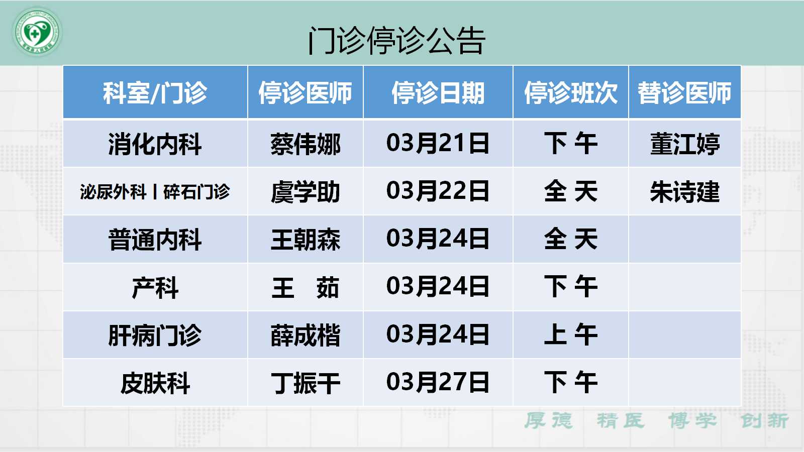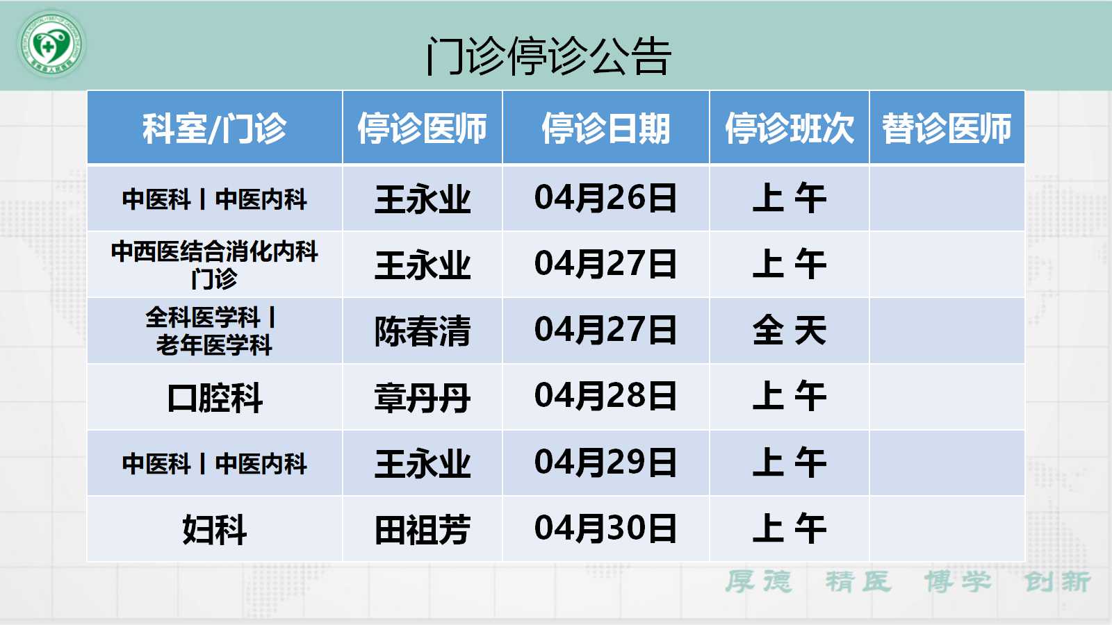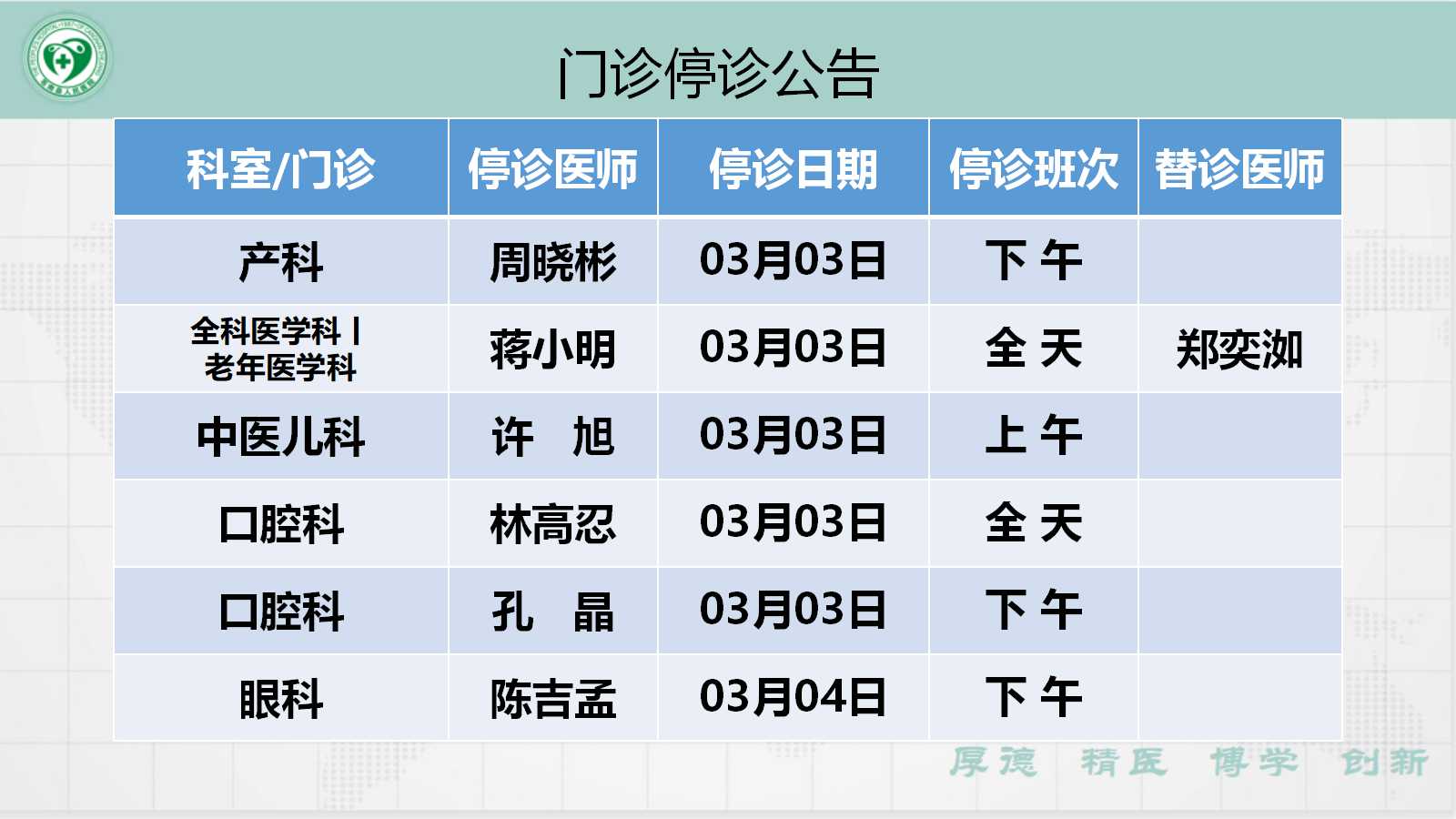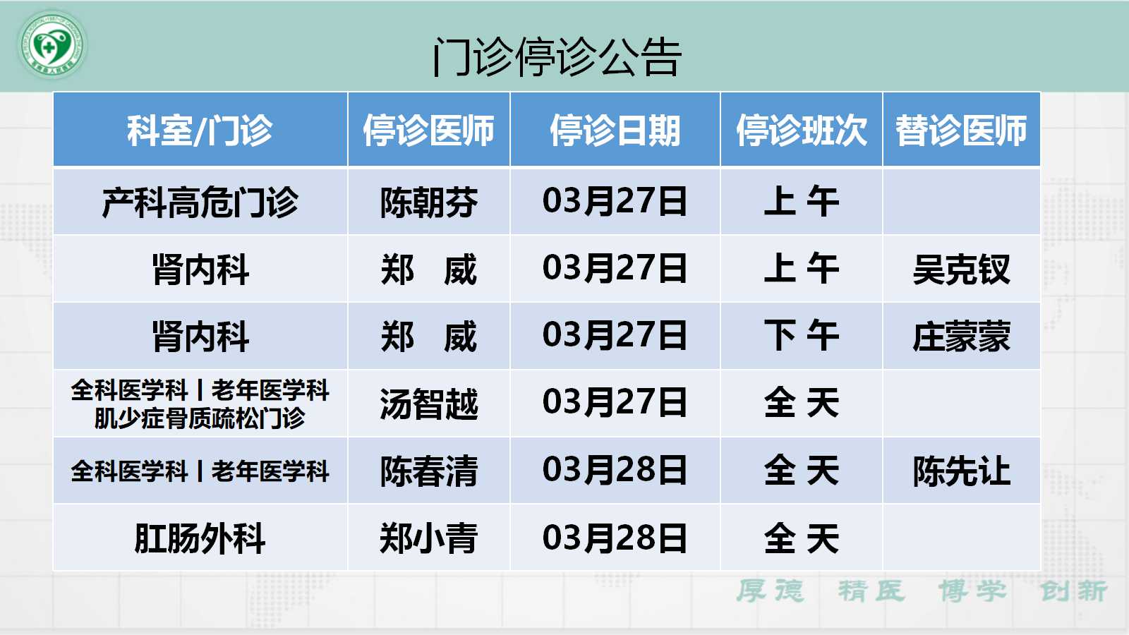 当前位置: 首页 > 医疗服务> 停诊公告