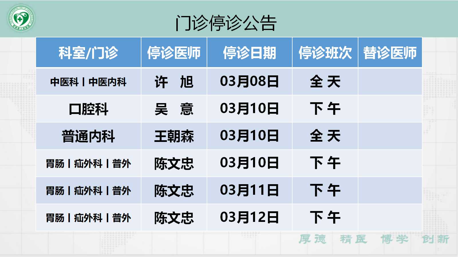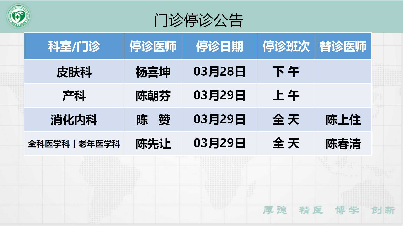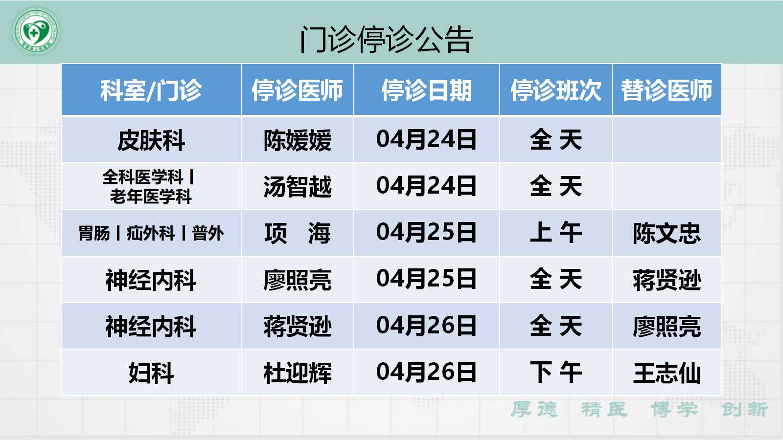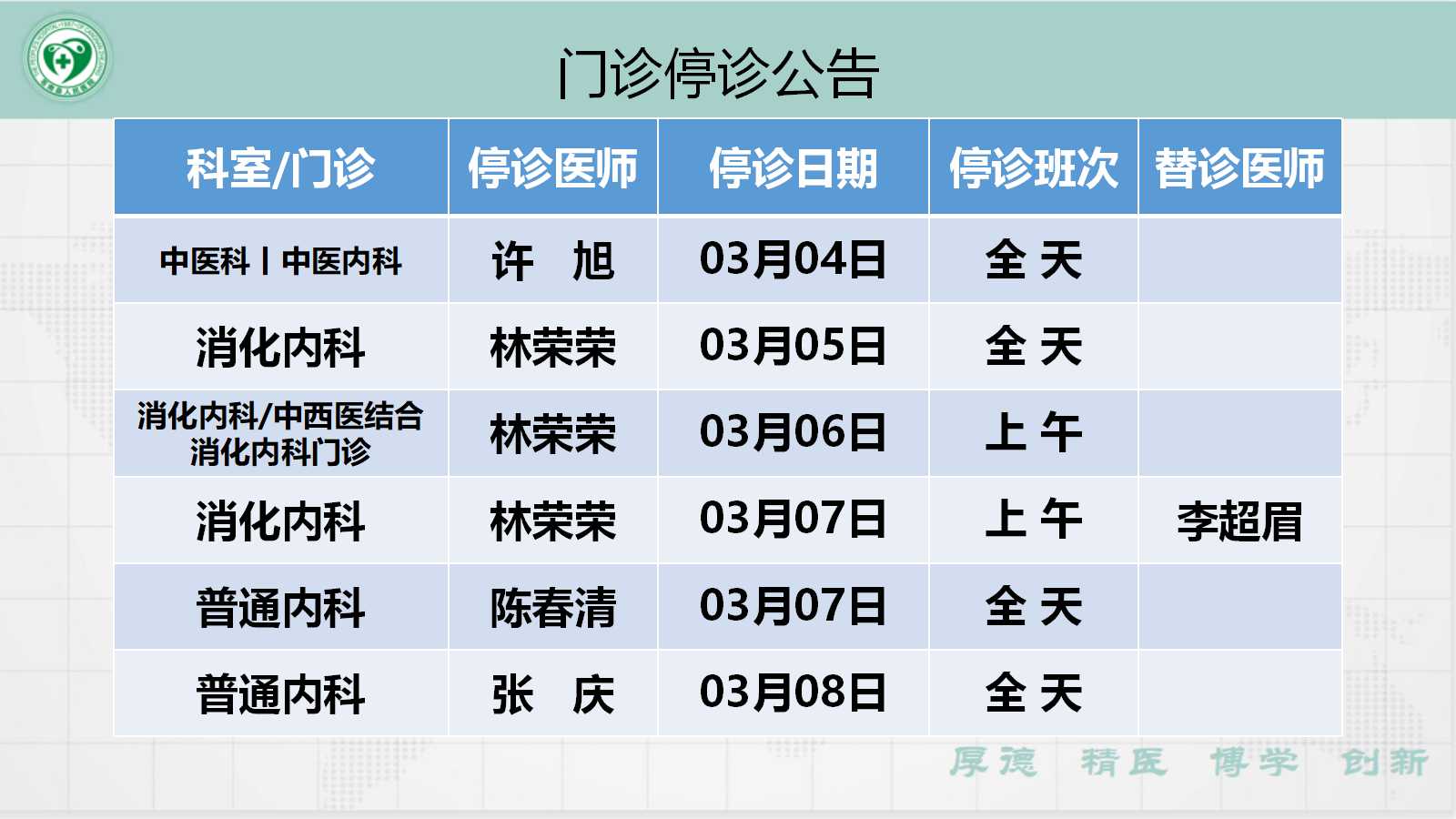当前位置: 首页 > 医疗服务> 停诊公告