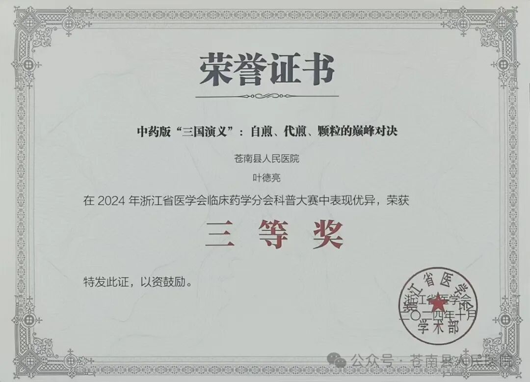 随着健康中国战略的深入推进,公众对于医药健康的认知需求日益增长。在这样一个信息高度发达的社会中,准确且易于理解的科普知识显得尤为重要。为响应国家关于“健康中国”的号召,以及《全民科学素质行动规划纲要(2021-2035年)》的要求,浙江省医学会临床药学分会和温州市药学会临床药学专业委员会分别举办了“2024年浙江省医学会临床药学分会科普大赛”与“第三届‘健康浙江’——合理用药科普短视频大赛温州晋级赛”,我院药学人员积极参与并荣获佳绩。 市赛“一等奖” 10月15日,在“第三届‘健康浙江’——合理用药科普短视频大赛温州晋级赛”中,我院药剂科推送的科普短视频《住院不输液,静脉也想放假》荣获一等奖。各评委对主题高度认可,并对多方言版本大加赞赏。 我国输液现状相当于每人每年使用了8瓶液体,远远高于国际上2.5~3.3瓶的水平。公众对输液存在一定的误区,为此,我院药师通过趣味动画的形式讲述静脉输液的相关科普知识,并将其翻译成具有苍南地域特色的不同方言版本,以便不识字的老人孩子也能获取正确的信息。 省赛再创佳绩 10月18日,“2024年浙江省医学会临床药学分会科普大赛”在杭州火热举行。大赛组委会组织的全省资深药学专家材料审核、初评环节,我院药剂科共有3篇科普文章突破重围闯进入现场决赛圈,在现场答辩环节表现优异并获得多项佳绩。 用药找药师 药学科普是药师的职责与使命之一,将复杂的医药知识以通俗易懂的方式传达给公众,减少患者用药错误的发生。苍医药师将继续致力于开展更多高质量的科普活动,不断创新形式,丰富内容,使医药知识更加贴近百姓生活,为建设健康浙江、健康中国贡献更多的力量。