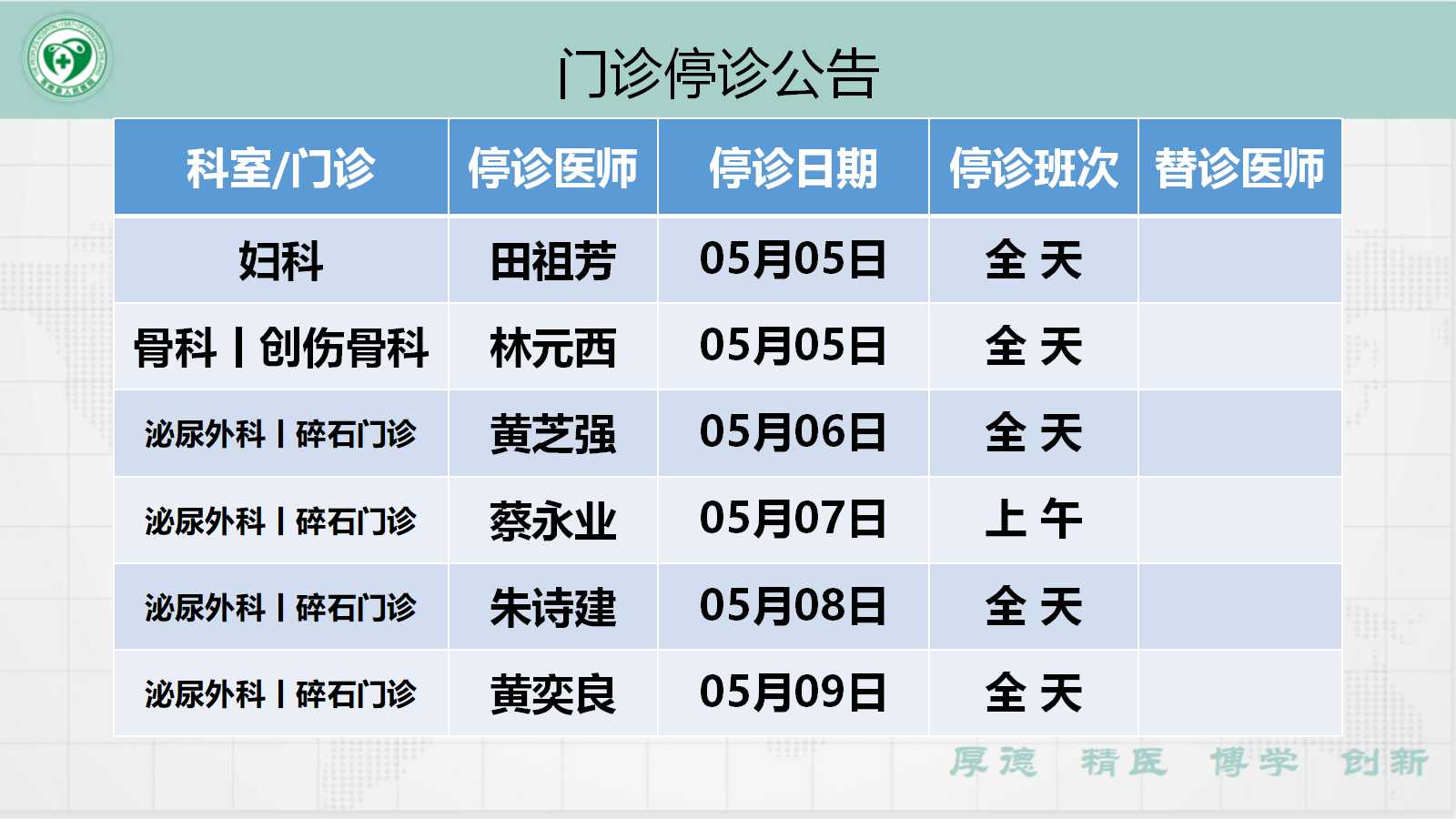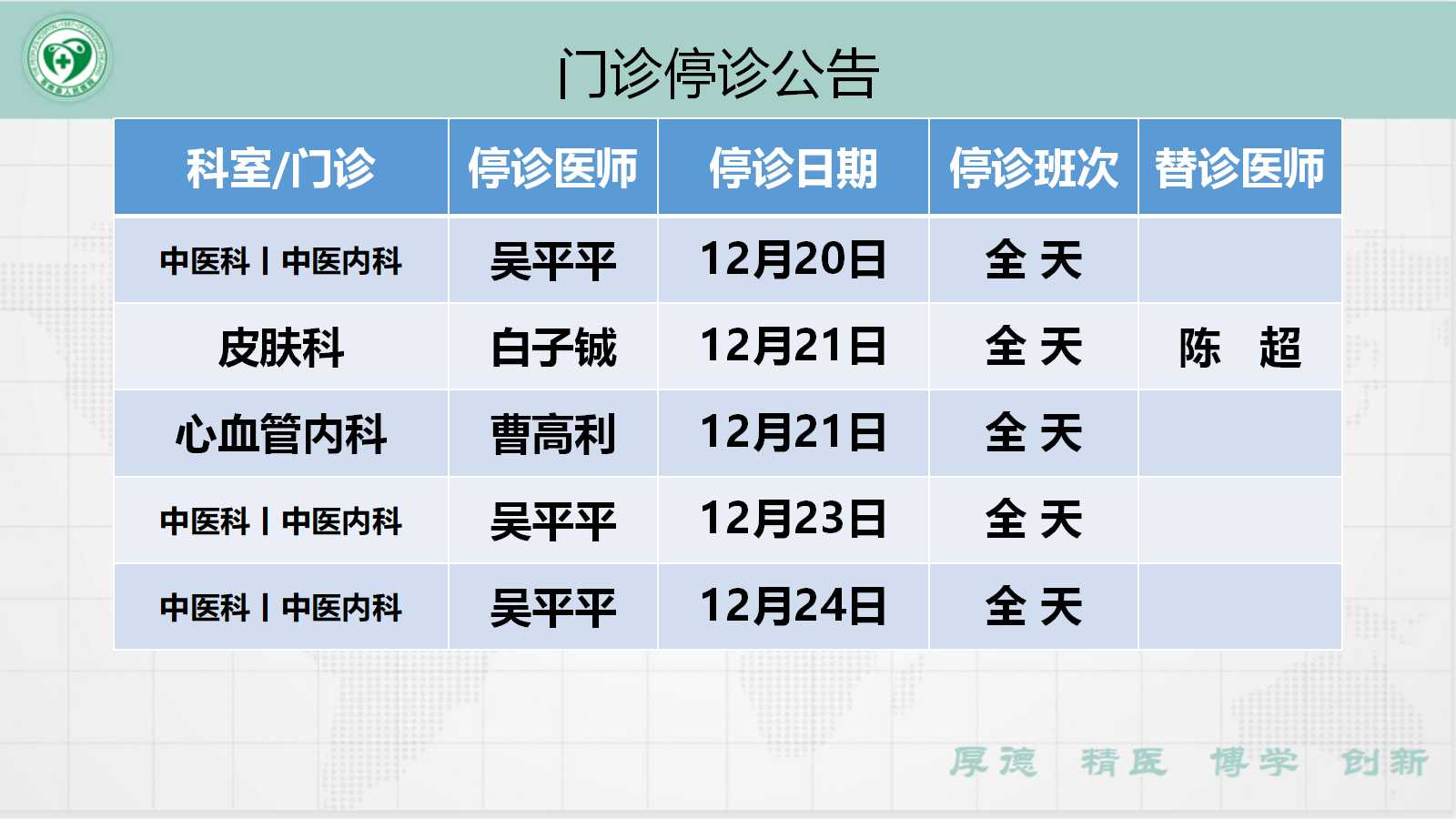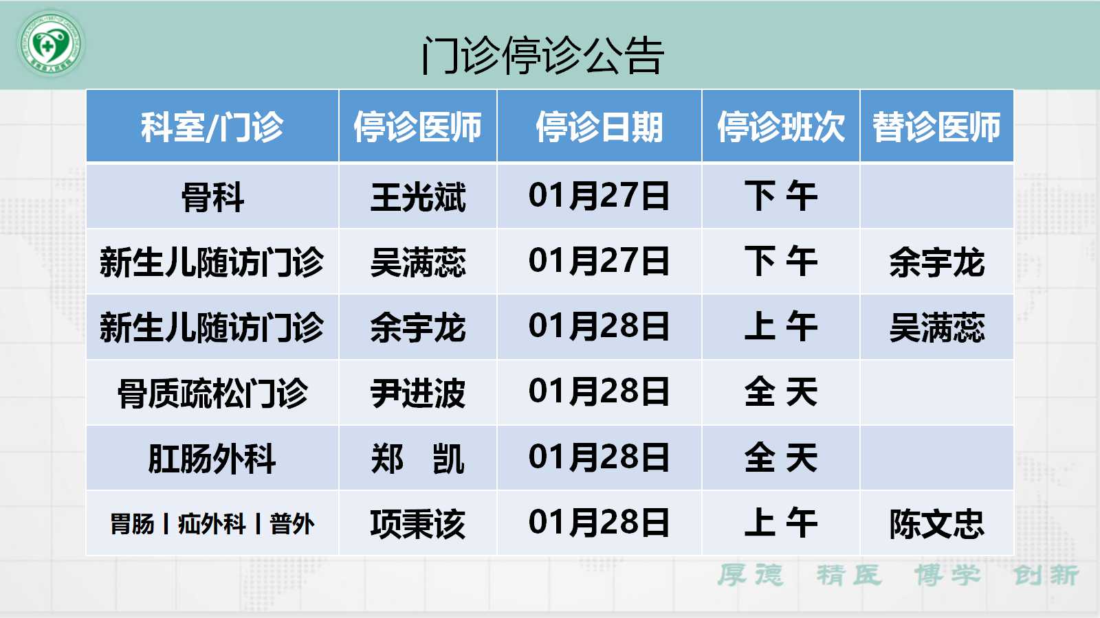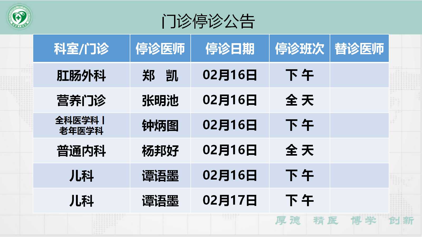 当前位置: 首页 > 医疗服务> 停诊公告